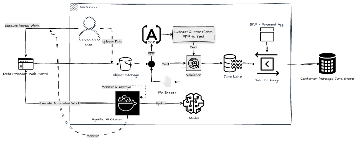 This architecture diagram depicts an automated data ingestion and processing pipeline that leverages both manual and automated workflows, with a focus on OCR, validation, and AI-driven improvement loops, all operating within the AWS cloud. Below is a step-by-step breakdown of each component and the AWS native services you would likely use to implement it: