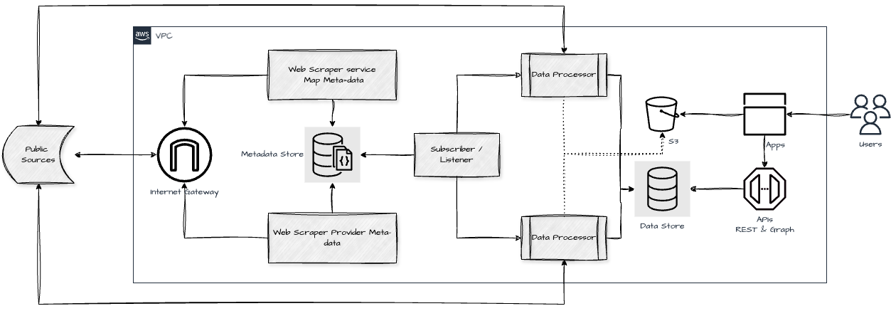 This architecture diagram represents a public data ingestion and processing pipeline powered by web scraping and downstream data processing, ultimately serving users via apps and APIs.